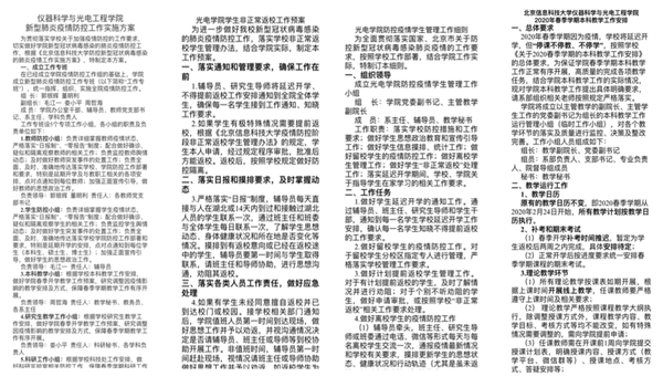 根据学校防控疫情工作要求,光电学院快速响应,成立防控疫情工作专班。班子成员分工牵头完善细化学院防控疫情各项工作实施方案,确保工作全面有序推进。明确划拨专项党费支持学院疫情防控,积极保障各项防控措施落实到位;细化防控疫情本科教学工作安排、学生管理工作细则、学生非正常返校工作预案,确保学生在家做好疫情防护的同时顺利开展网络学习。班子成员有人放弃探亲在京留守,有人大年初一返京待命,以疫情防控为号角,主动担当作为。与此同时,1月31日,学院党委向全体师生党员发出号召,从自身做起,科学防疫,为夺取疫情防控胜利贡献力量。学院全体师生在班子成员的带领下,步调一致、团结协作,切实将各项防控疫情工作落实到位。