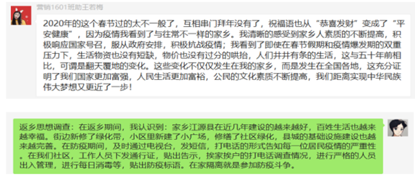 调查会上,还有许多学生党员感慨家乡在国家政策的支持下,生态环境和城市建设发生的巨大变化。学生党员王若梅说到:“家乡的变化是翻天覆地、有目共睹的。2020年是全面建成小康社会和“十三五”规划收官之年,是脱贫攻坚的决胜之年,相信在党的带领下,在全国人民的共同努力下,我们会以更坚定的信心、更顽强的意志、更果断的措施,坚决打赢疫情防控阻击战,为如期实现“两个一百年”奋斗目标奠定坚实基础”。