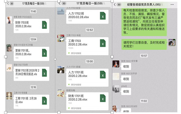 学生党员和积极分子积极监督劝导班级同学遵守学校规定不离家、不返京、不返校。值班党员每天三次转发党委学生工作部(学生处)发布的《关于疫情防控期间瞒报个人信息情况的通报》;每天三次转发学院重要提醒,告知班级同学严禁以任何理由和形式返京、返校;未经批准返校、返京将给予严肃处理等相关规定。