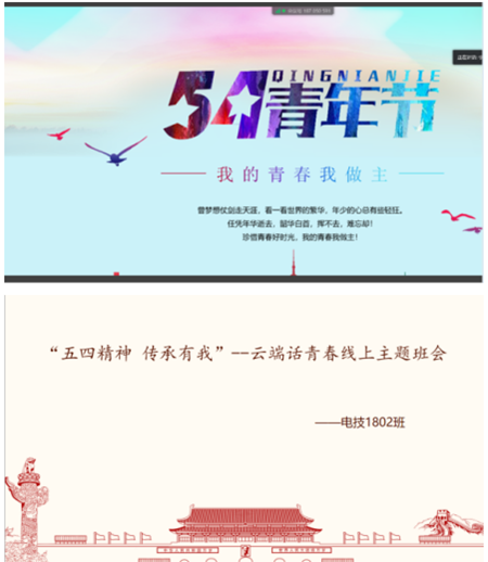 有的班级结合“五四精神 传承有我”素材征集活动,在线分享了班级同学自己创作的作品,以作品抒发爱国之情、以作品增强责任意识。