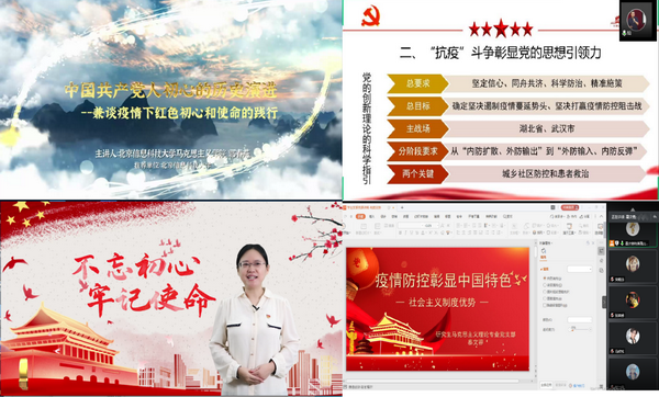 德育与法学教研部党支部苏灿老师从“抗疫”斗争彰显党的政治领导力、思想引领力、社会动员力和群众组织力四个方面,讲述了“‘抗疫’斗争彰显党的领导力—中国共产党为什么能?”。