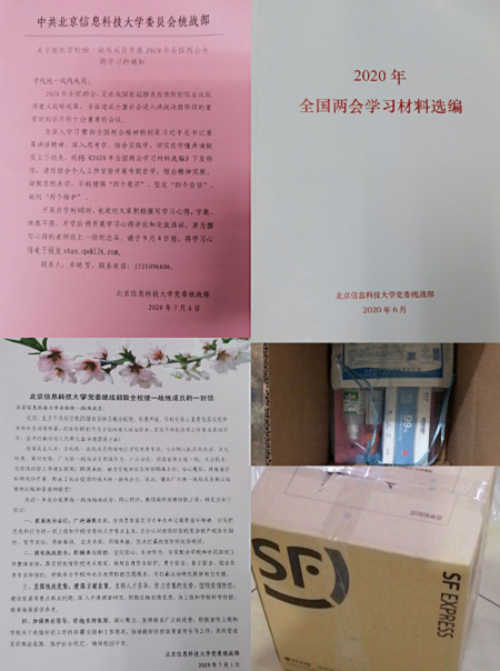 为确保个人卫生与健康,统战部将疫情防控用品爱心包和《2020年全国两会学习材料选编》、《关于组织学校统一战线成员开展2020年全国两会专题学习的通知》、《致全校统一战线成员的一封信》一起寄发给学校统战人士。老师们在收到学习材料和防疫用品后,纷纷表示收到寄来的学习材料和防疫用品好温暖、好感动,感谢组织关心和记挂,一定认真学习,撰写学习心得,确保学习防疫两不误!