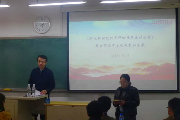 授课过程中,于世洁时常与同学们互动。结合各省教育改革情况,讲述了宏观背景下教育评价在改革发展中的复杂性和艰巨性。他结合教育评价方案中对于学生评价的要求,列举了大学生学习生活中可能出现的不良现象和常见问题,深入浅出的为同学们剖析成长路上的绊脚石。激励同学们将自身发展与国家建设相结合,做有理想、有追求、有担当、有作为、有品质、有修养的大学生。