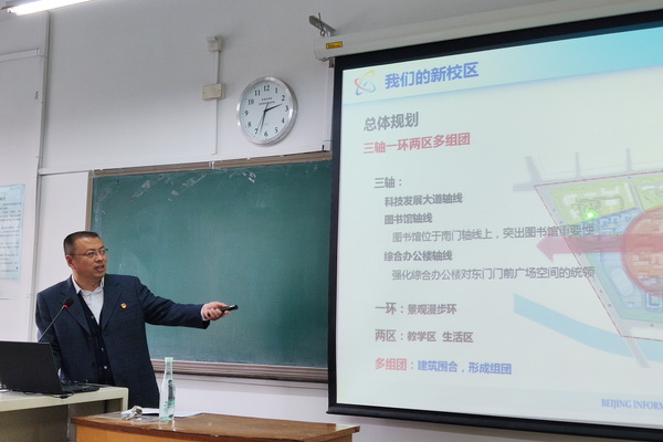 马綮鸿以“怎样认识一座城市”为切入点,将城市化发展特点、城镇发展问题以详实数据呈现给大家。他围绕北京城市总体规划和“京津冀”协调发展理念深入浅出地阐释了北京“为什么要疏解”,并结合党的十九大、十九届五中全会精神对“区域协调发展”战略做出详细解读。对于师生特别关切的新校区建设情况,马綮鸿从政策依据、总体规划、空间设计、建设情况、工作进展等几个方面加以介绍。他同时谈到,作为北京市“疏解整治促提升”重点项目,新校区建设既为实现学校跨越式发展提供空间保障,是广大师生员工的迫切愿望,更是落实疏解非首都功能的总体部署、完成北京市“疏整促”专项行动的重要举措。