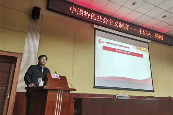 12月9日,副校长陈刚在国际学术交流教室为外国语学院学生讲授了题为“中国特色社会主义制度”的形势与政策课,外国语学院领导班子、教师代表以及学院全体学生党员和积极分子100余人参加了此次课程学习。
