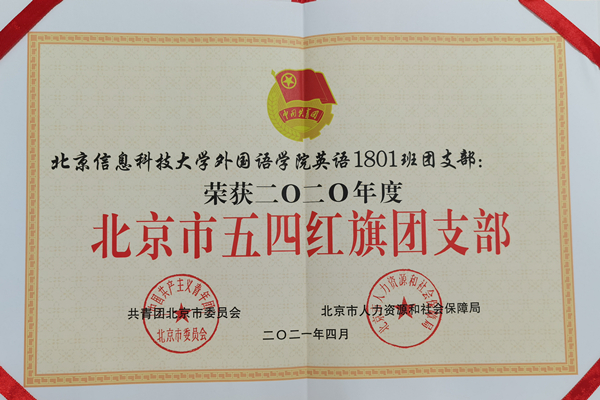 近日,共青团北京市委员会、北京市人力资源和社会保障局联合发布了2020年度“北京市优秀共青团员、优秀共青团干部、五四红旗团委(团支部)”表彰名单,其中我校外国语学院英语1801团支部喜获“北京市五四红旗团支部”称号。