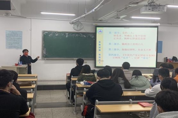 学院党委书记曹晋红以“守党纪,做政治上的明白人”为题,围绕党章的发展历程、党的民主集中制原则,为同学们讲授了党章党纪专题党课。曹晋红表示,新时代我们不仅要不断加强理想信念教育,也要加强落实民主集中制和纪律强党思想。随后与辅导员李华艳老师一同开展“红歌里的党史教育”,同学们在现场红色歌声中,学习了解党的历史。