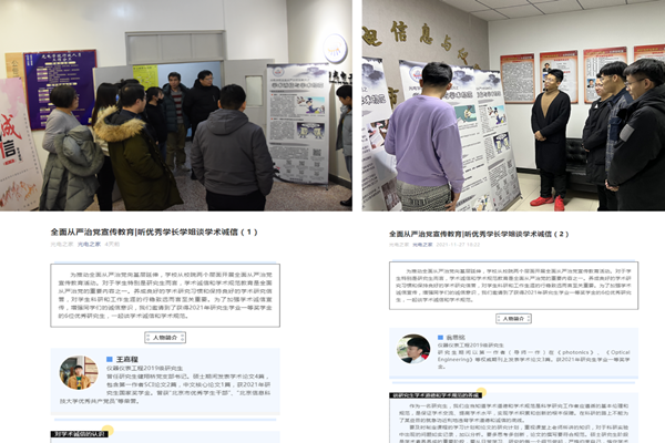 系列特色宣教活动契合日常学习工作,克服了疫情不利影响,达到了学以致用、守纪慎行的教育成效。师生携手积极践行“勤以为学、信以立身”校训精神和“励学修身、求真唯精”的院训精神,不断提升廉洁从政、从教、治学意识,共同营造风清气正的政治生态和诚实守信的育人氛围,为开启“十四五”发展新篇章打下坚实基础。(供稿/图片:光电学院 沈度 编辑:张帆 审核:王学文)