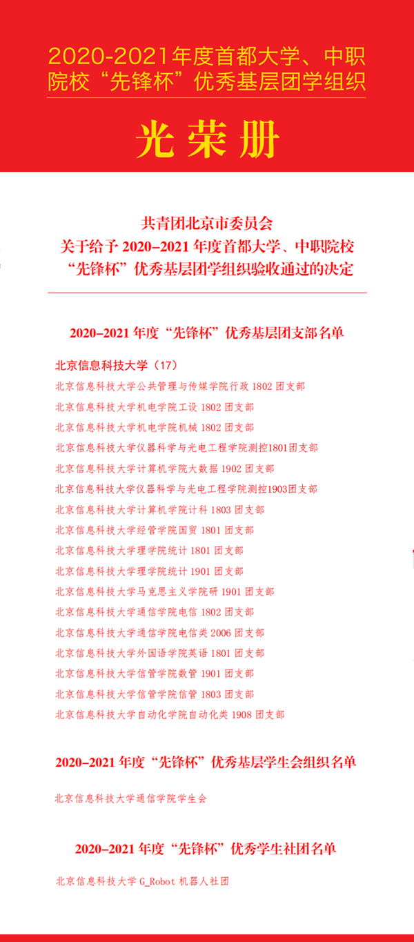 近日,共青团北京市委员会发布《关于给予2020-2021年度首都大学、中职院校“先锋杯”优秀基层团学组织验收通过的决定》,我校共有19个团学组织符合标准、通过验收。