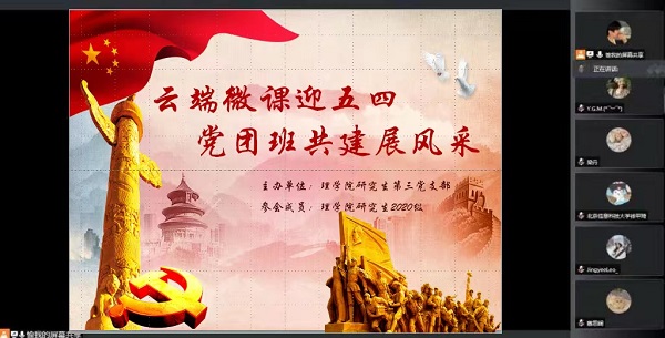 五四青年节前夕,理学院2020级研究生开展了以“云端微课迎五四,党团班共建展风采”的线上微党课共讲共学活动,共话五四精神,传承红色基因。本次活动依托理学院“党课人人讲”学生思政一院一品项目,紧扣该项目2022年主题“红色筑梦新时代,青春闪耀新征程”,由研究生第三党支部认真筹备、精心组织,2020级团支部充分动员、积极准备,两个班级40余名同学参与在线学习交流。