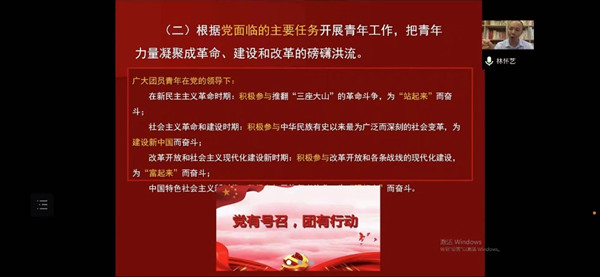 开班仪式后,华侨大学教授、博士生导师林怀艺为学员作主题为“党有号召,团有行动——学习习近平总书记在庆祝中国共产主义青团成立100周年大会的讲话精神”的培训报告。林怀艺讲述了中国共产主义青年团是什么、要做什么,中国共产主义青年团的奋斗历程,中国共产党领导青年工作的基本经验等问题,让学员们对团史、团组织有了深刻而全面的认识,了解到共青团是树立信仰的大家庭,是素质拓展的大熔炉,是服务社会的大舞台。(供稿/图片:校团委 迟淋荟 李林 编辑:张帆 审核:杨静)