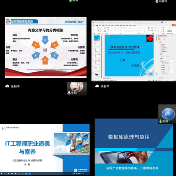 会上,计算中心周淑一老师交流了信息类通识课的课程思政教学经验;计科系朱敏玲主任以“助力国产芯片、担起民族责任”为题,结合“计算机组成原理”课程,分享了如何开展思政微课的经验;软工系牛科老师结合所授课程“IT工程师职业道德与素养”,分享了如何将思政教育融入到专业课的经验;网工系教师党支部书记张良分享了“通过以国产化数据库为抓手”,开展课程思政的经验;殷波老师分享了在“计算机网络基础公选课”教学过程中体现社会主义核心价值观,培养社会主义建设者和接班人的经验。