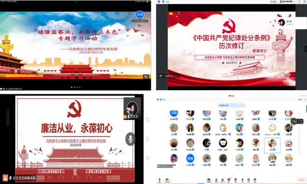 为持续推进全面从严治党向纵深发展,引导学生自觉树立纪律意识,保持清正廉洁品格,5月份至今,马克思主义学院研究生党支部开展了全面从严治党宣传教育系列活动,支部全体党员及入党积极分子积极参加并交流了自己的心得体会。活动均采取线上方式进行。
