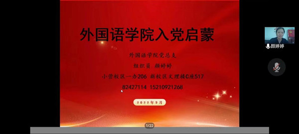 为加强外国语学院2022级新生对中国共产党的认识和理解,端正入党动机,了解入党流程,9月2日下午,外国语学院党总支线上组织开展了2022级新生入党启蒙教育。学院组织员颜婷婷,外国语学院英语专业、翻译专业本科生联合第一党支部和第二党支部负责人以及全体2022级新生参会。