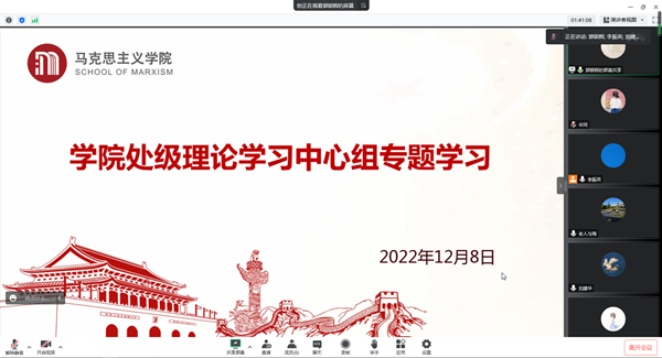 12月8日,马克思主义学院处级理论学习中心组通过腾讯会议专题学习习近平总书记在江泽民同志追悼会上致的悼词,深切缅怀江泽民同志,并就习近平总书记在中共中央政治局第一次集体学习时的重要讲话精神进行研讨。学院党总支书记郭银辉主持,中心组全体成员参加学习。