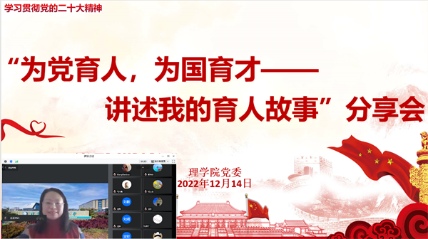 12月14日,理学院以线上形式举办“为党育人、为国育才——讲述我的育人故事”分享会,深入学习宣传贯彻党的二十大精神。学院班子成员和全体教师参加,活动由副院长王爱文主持。