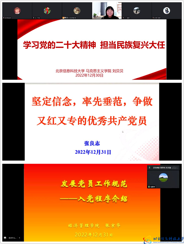 1月5日,优秀党员代表曹佳玮、孟雅雯、李仲媛分别以《团结奋斗创发展伟业 脚踏实地做优秀青年》、《全国样板党支部报告》、《让二十大精神“落地生花”》为题进行了支部建设与个人成长的心得分享。