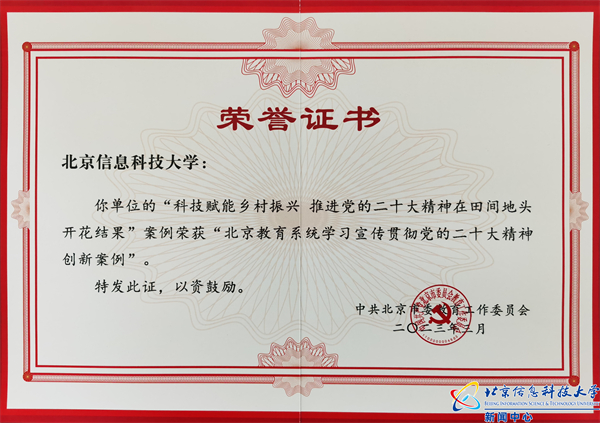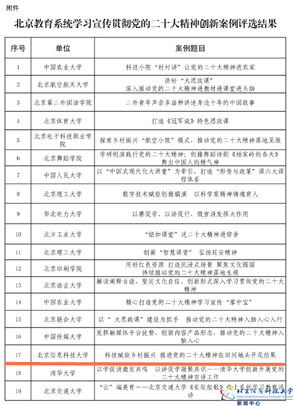 近日,北京市委教育工委公布了北京教育系统学习宣传贯彻党的二十大精神创新案例评选结果,我校党委宣传部组织申报的“科技赋能乡村振兴 推进党的二十大精神在田间地头开花结果”案例成功入选。公示通知显示,北京教育系统共评出50个创新案例入选公示名单。