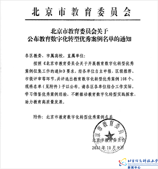 此次获评北京市教育数字化转型优秀案例,是对我校前期智慧教学系统建设工作的充分肯定。教育数字化转型,是一个长期实践累积的系统工程。作为信息特色鲜明的大学,在今后的信息化建设和教学工作中,将始终坚持基于学校一线教学的需求和互动反馈,按系统性规划、技术面创新、问题层驱动、持续性迭代的方法,持续推进教育数字化转型工作。(供稿/图片:信息与网络管理中心 程会敏 编辑:张帆 审核:杨静)