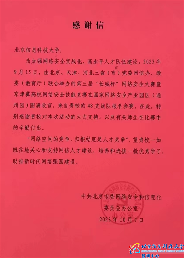日前,学校收到中共北京市委网信办发来的感谢信。来信充分肯定了我校在第三届“长城杯”网络安全大赛暨京津冀高校网络安全技能竞赛中的努力付出,鼓励学校继续关心支持网信人才建设,培养和选拔一批优秀学子助推新时代网络强国建设。据悉,我校是赛后唯一一所收到市委网信办感谢信的市属高校,也是近年来第一个收到市委网信办感谢信的市属高校。
