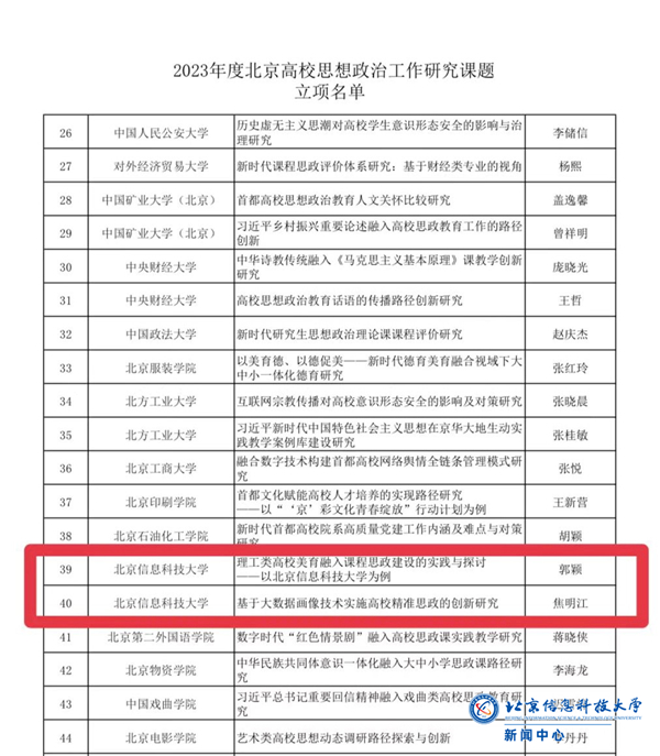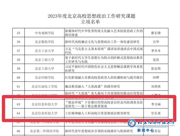 2023年度北京高校思想政治工作研究课题立项名单日前公布,我校四项课题获批立项,立项数量在市属高校名列前茅。