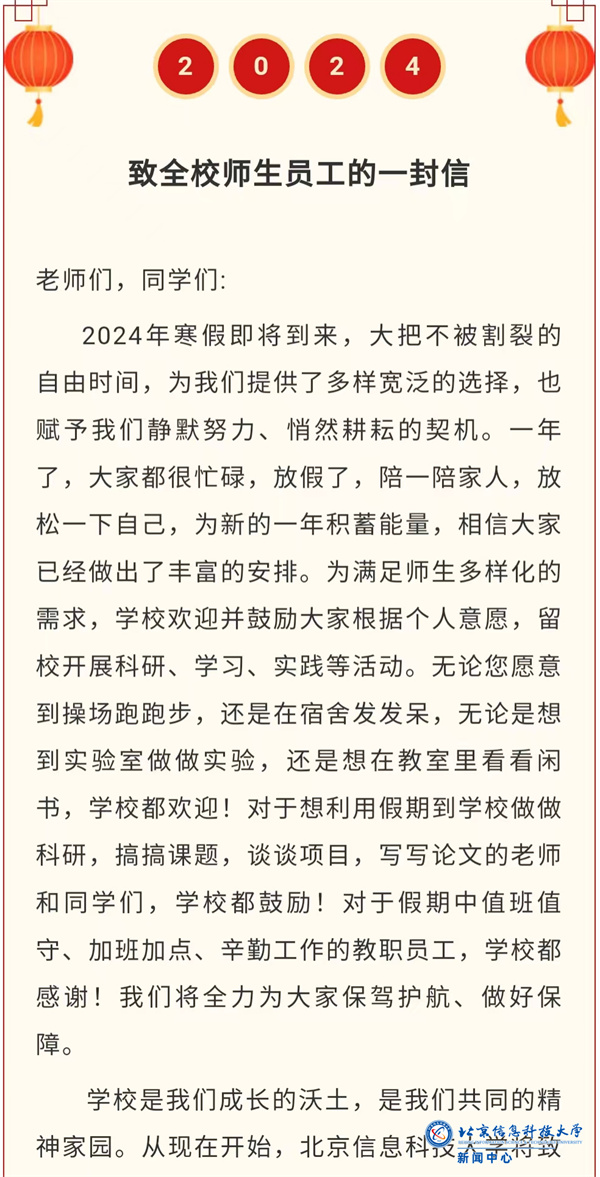 “今年寒假,学校不打烊,让我觉得踏实、安全、温暖、方便。我相信,不打烊的寒假一定是最充实、能够结出累累果实的假期。”图书馆朱荀老师说。寒假来临之际,为满足师生多样化的需求,在“这个寒假,校园不打烊,关爱不放假”这封致全校师生员工的信中,学校要求各个部门提前部署,做好服务,不能电话接不通,找人找不到,事情办不了,要求教室、食堂、宿舍、实验室、快递收发等重点场所全力服务好师生,受到了社会与师生的一致好评。