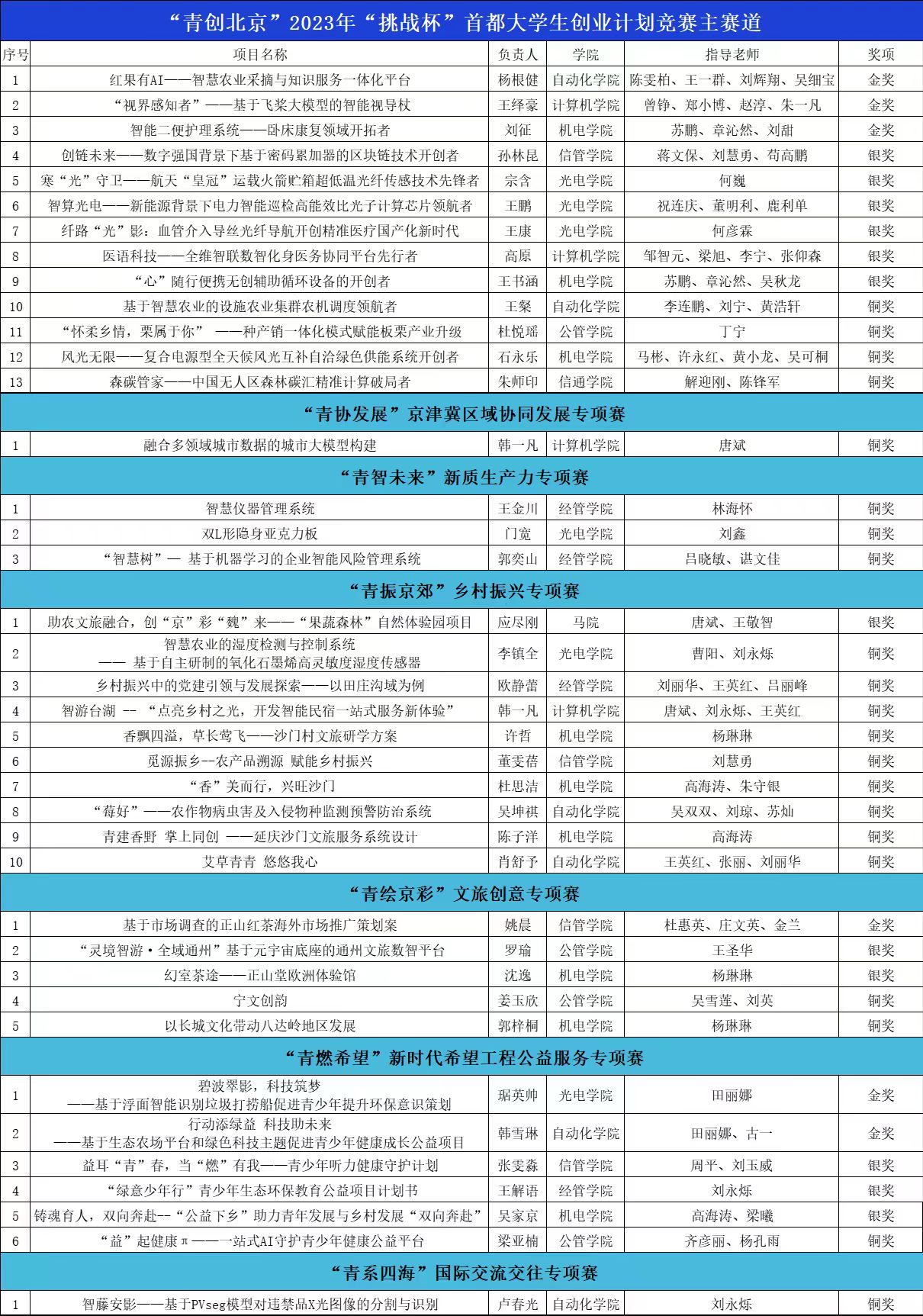 近日,“青创北京”2024年“挑战杯”首都大学生创业计划竞赛在北京市海淀区民族剧院落下帷幕。我校在主赛道获得金奖3项、银奖6项、铜奖4项;专项赛获得金奖3项、银奖6项、铜奖17项,总成绩位列首都高校第11名,再次捧起首都“优胜杯”!