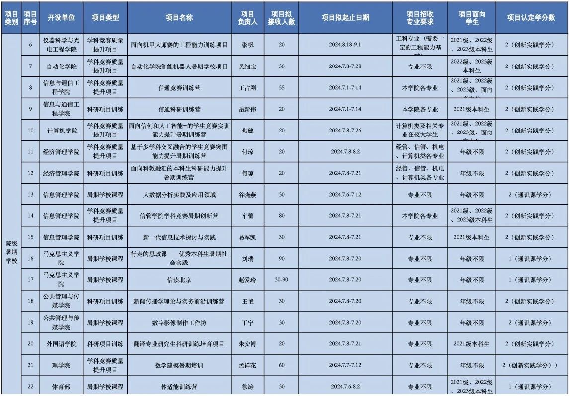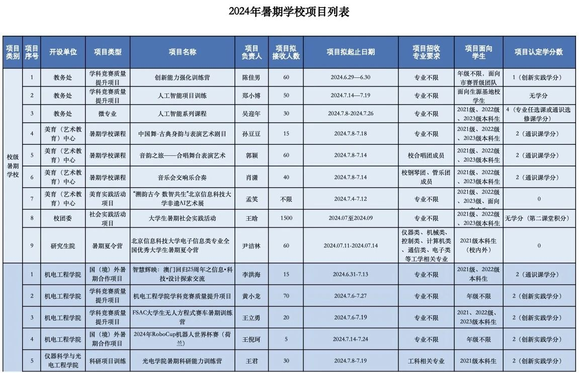 为落实学校建设“全年大学”目标,充分利用学校优质教育教学资源,打造更立体的学术交流平台,促进更广泛的学术交流活动、培育更浓厚的校园学术氛围,对内更好服务师生,对外提高学校美誉度,进一步推动温暖校园、安静校园、活力校园建设,北京信息科技大学面向我校全体在校本科生、研究生和生源基地校高中生,开设2024暑期学校。