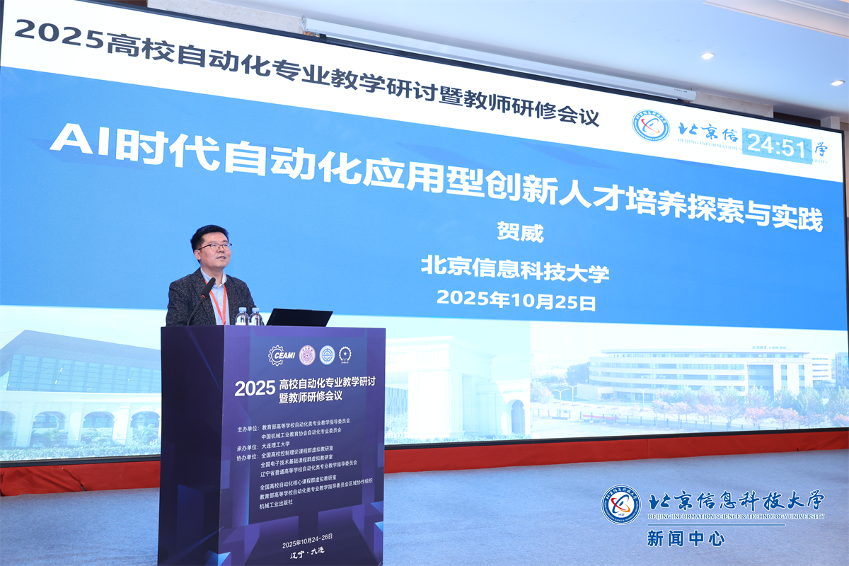 10月25日,校党委常委、副校长贺威带队赴大连参加由教育部高等学校自动化类专业教学指导委员会、中国机械工业教育协会自动化专业委员会联合主办的“2025高校自动化专业教学研讨暨教师研修会议”。本次会议由大连理工大学承办,贺威作为大会特邀嘉宾参加并作专题报告,与领域内专家学者共同探讨自动化专业教育的深化与创新。