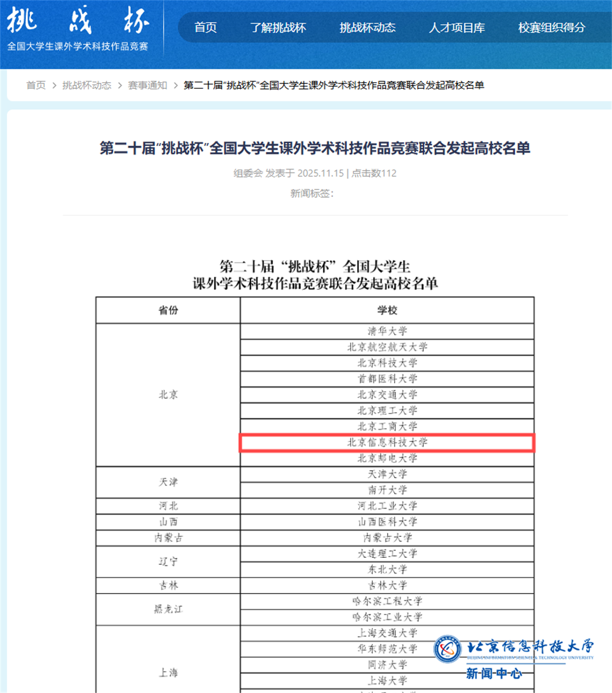 11月15日,全国“挑战杯”竞赛组委会根据第十九届全国竞赛赛事结果,公布了第二十届“挑战杯”全国大学生课外学术科技作品竞赛联合发起高校名单,我校首次进入“挑战杯”发起高校行列。