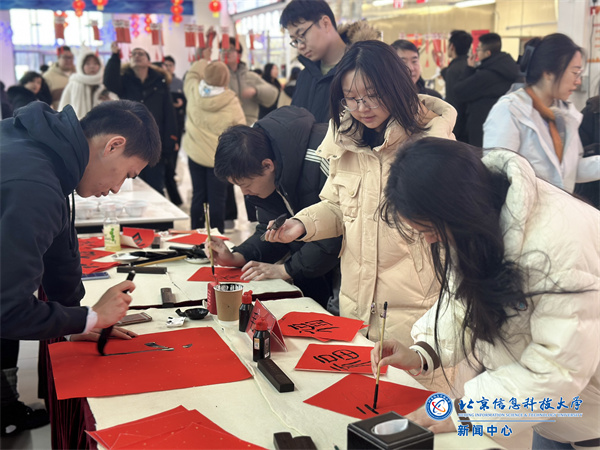 在“墨香写福字”摊位前,师生们挥毫泼墨,用笔尖传递新年祝福和美好祈愿。