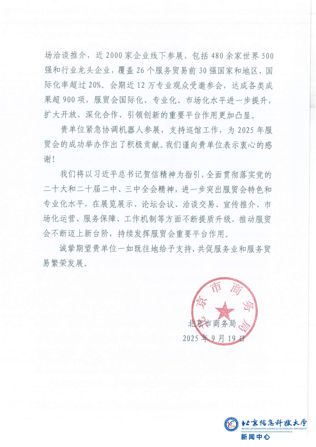 9月19日,北京市商务局向我校发来正式感谢信,对我校在2025年中国国际服务贸易交易会(服贸会)中的突出贡献表示衷心感谢。感谢信特别指出:"贵单位紧急协调机器人参展,支持巡馆工作,为2025年服贸会的成功举办作出了积极贡献。"这充分体现了北京市政府部门对我校技术实力和组织能力的高度认可。我校作为北京市市属高校,能够参与此次重要的活动,也体现了北京市政府对我校的信任和重视。