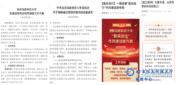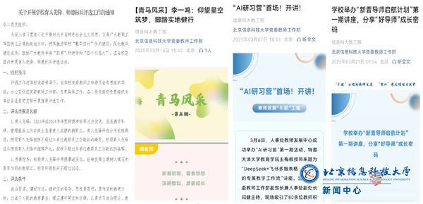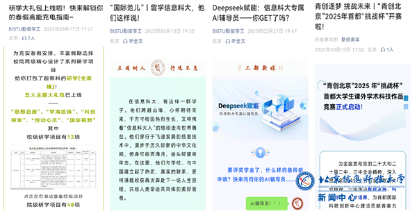 二是聚焦党建引领,凝聚三风育人合力。党校办统筹校级层面含为师生办实事,构建“充分调研-建立清单-协同攻坚-督查督办-效果评估”闭环机制,进一步办好事、办实事、解难题、促发展。党委组织部起草“双创”和加强基层党组织建设相关文件,并下发征求意见;发挥“勤信组工”作用,开设“勤实信行”报道专栏,通过策划报道、撰写评论文章等方式,拓展报道深度。党委宣传部完成小营校区建筑物、活动场地命名,以及校园指示牌和楼体标识牌制作;启动北京信息科技大学(张家口)道路命名、楼宇命名等有关工作,提升校园文化内涵,为师生营造良好的校园文化氛围。党委教师工作部开展“育人先锋”“师德标兵”评选;推出“青马风采”系列报道,挖掘青年教师育人典型,搭建展示平台,报道优秀育人事迹;同时启动“新晋导师启航计划”,“AI研习营”,邀请手把手带领新晋导师成长,打造专属教学工作流。党委学工部为充实春假安排、丰富假期选择,校院两级精心设计了系列研学项目,引导学生走进自然与社会大课堂,实现知行合一;依托信息科大版DeepSeekV3+R1大模型,打造24小时AI辅导员,用AI赋能学生教育、管理与服务水平。党委学工部联合国际交流处在“勤信学工”设置新专栏“国际范儿”,全面提升学生国际视野与国际化能力。校团委启动“青创北京”2025年“挑战杯”首都大学生课外学术科技作品竞赛,为师生解读竞赛政策,分享备赛经验。